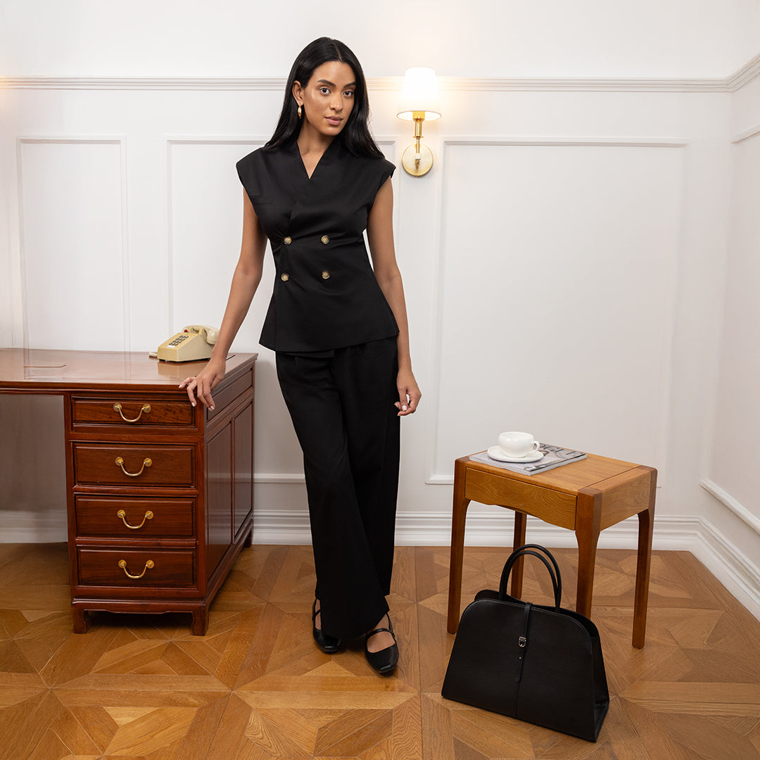Tailored set features a sleeveless double-breasted top with structured padded shoulders, paired with matching straight-leg trousers.