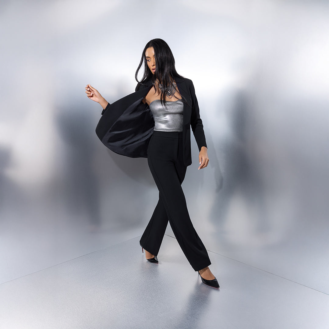 Black tailored suit features a sleek wrap-style blazer with a removable belt and matching high-waist straight-leg trousers.